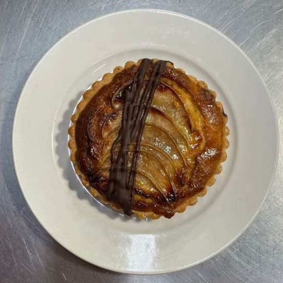 Deliciosa tarta rellena de pera con terminado de almendra o chocolate, tamaño individual.