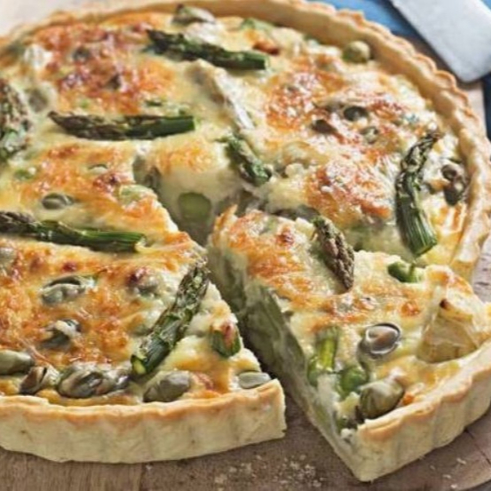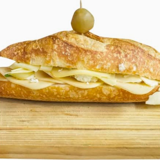 Baguette recién horneado con queso mozzarella, cabra y roquefort.