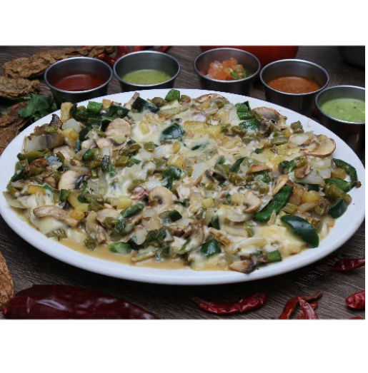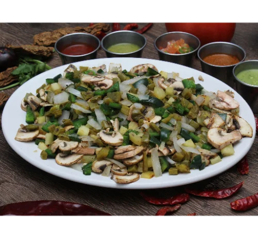 Chile poblano, champiñón, cebolla, nopal, queso y piña con tortilla de maíz.