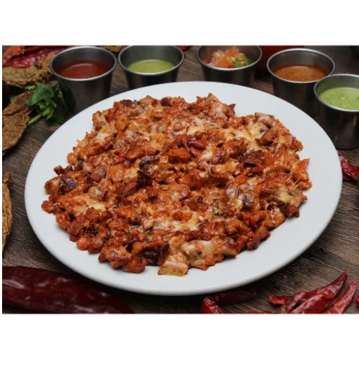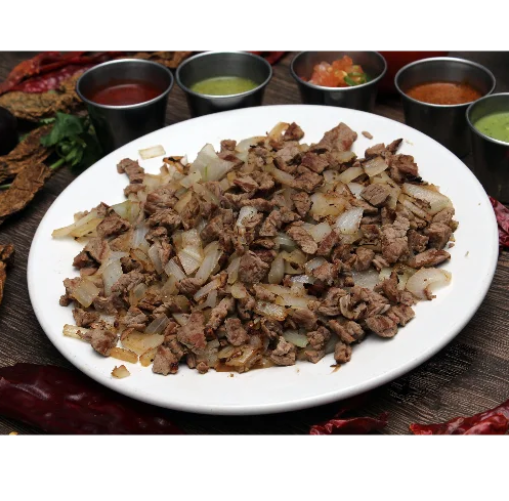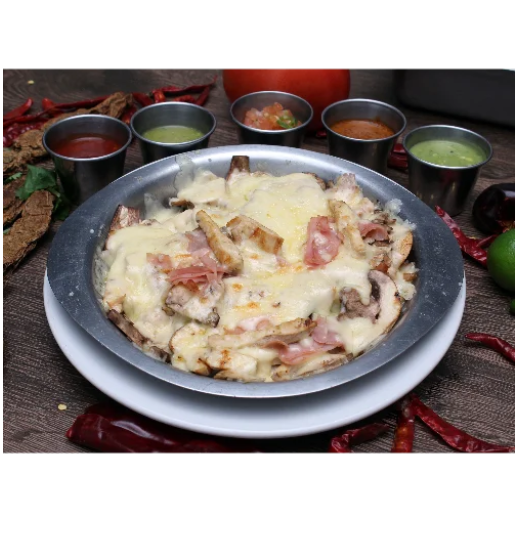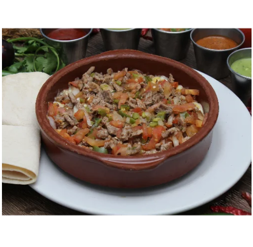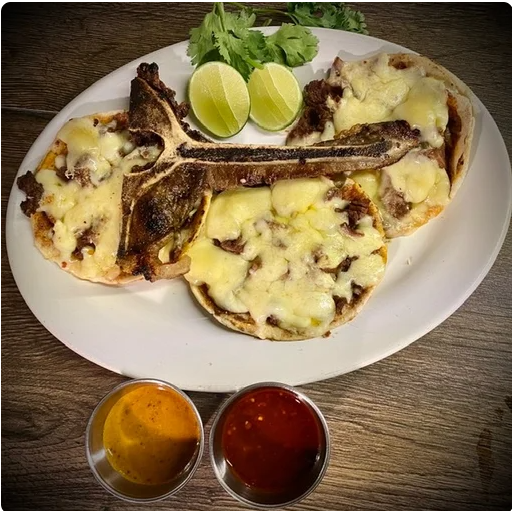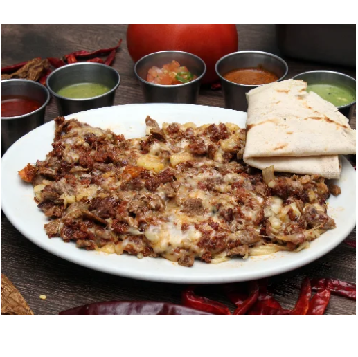 Queso de 300 gramos con 100 gramos de bistec y salsa mexicana sobre queso.