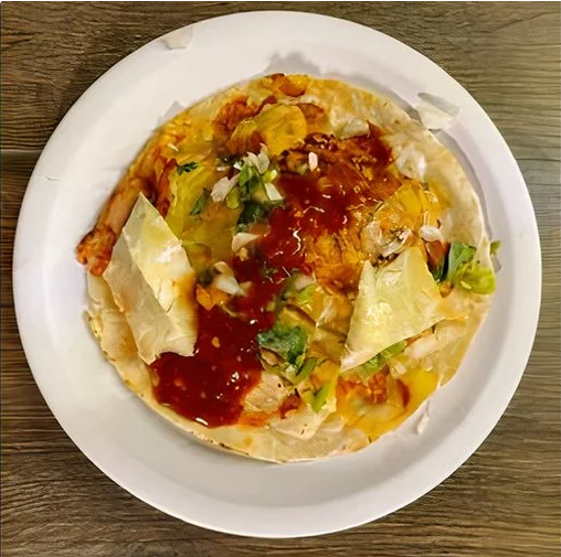 Pan árabe con frijoles refritos, salsa especial y carne.