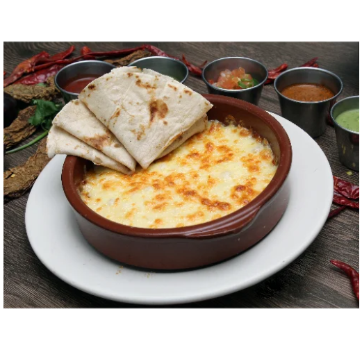 Queso manchego fundido, acompañado de tortillas de harina.