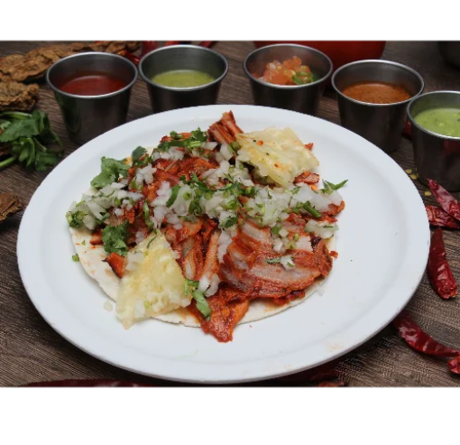 Taco con carne al pastor 100 gr, cebolla, cilantro piña, salsa roja.