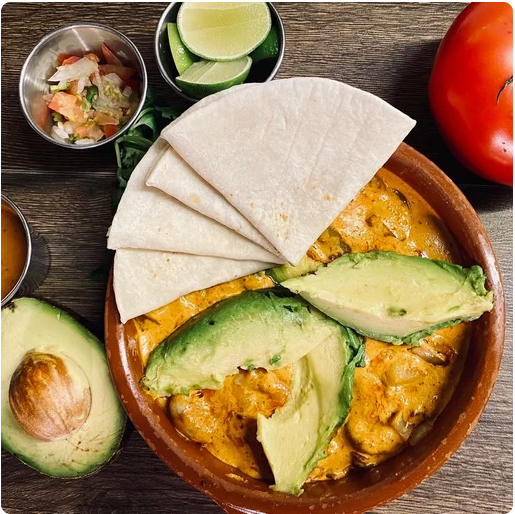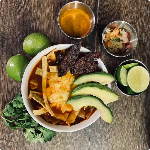 Sopa de tortilla con aguacate, crema, queso y crujientes julianas de tortilla. (Porción personal)