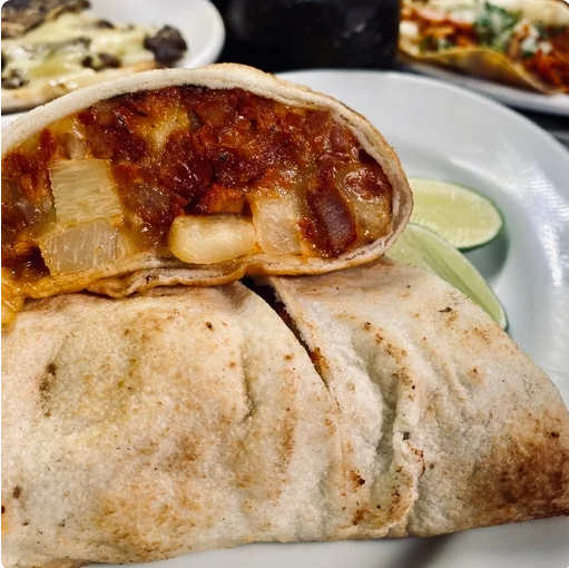 Gringa de queso y 100 gramos de carne al pastor entre 2 tortillas de harina.