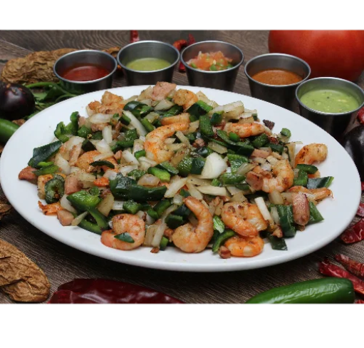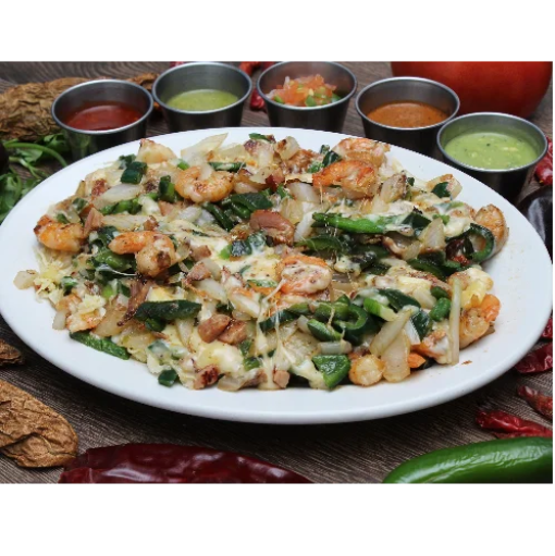 Camarón 100 gramos a la plancha, queso, cebolla y salsa.