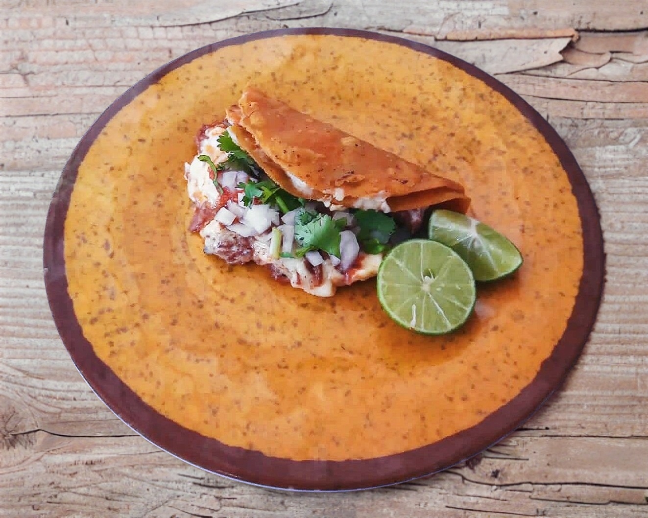 Jugosa carne de res con queso gratinado en una tortilla de harina doblada y ligeramente tostada con un toque de consomé.