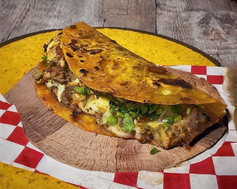 Deliciosa birria de res, con queso gratinado cubiertas en 2 tortillas doradas.