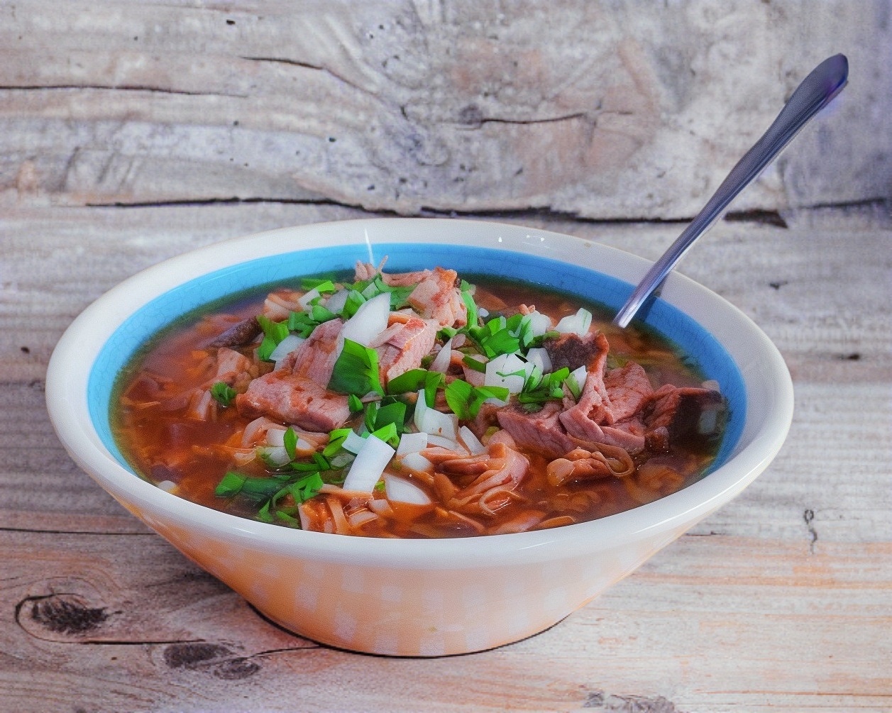 Exquisito consomé de birria de res estiló tapatío (incluye limones, cebolla, cilantro y salsa)