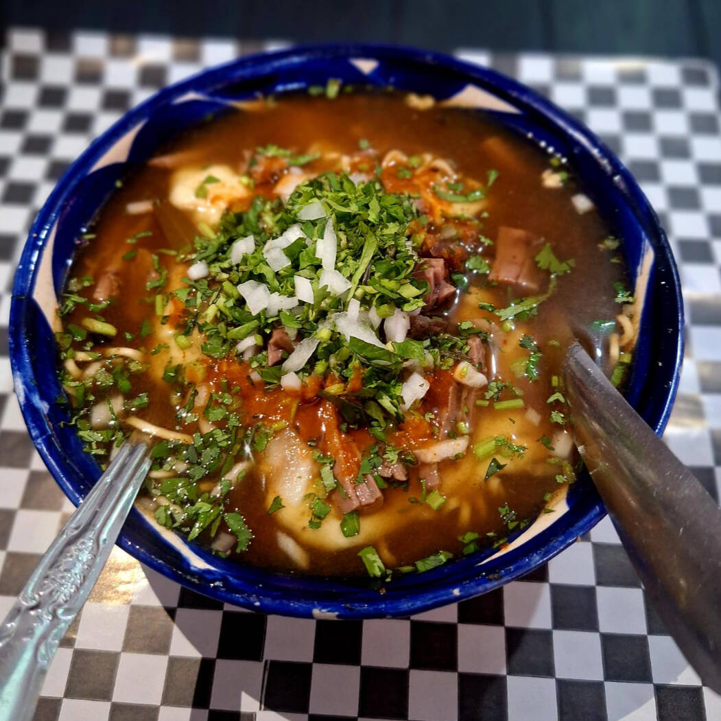 Birria picada MACIZA (Sin grasa) con su respectivo consomé y porción de tortillas; incluye salsa, rajas, chile asado, cebolla cilantro y limones.