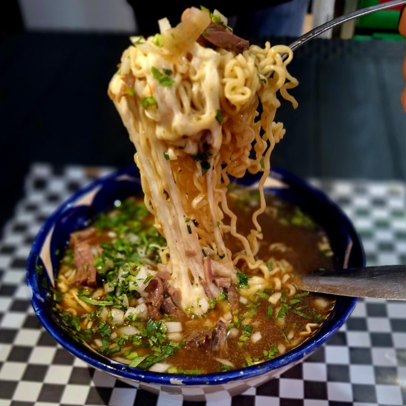 Delicioso ramen Maruchan en consomé con queso y birria picada; incluye cebolla, cilantro, salsa y limones.
