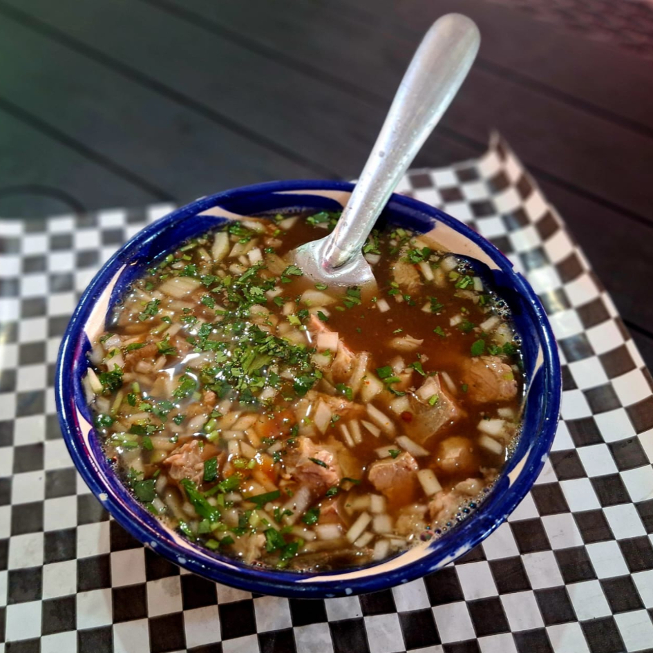 Orden de 5 tacos MACIZA (Carne magra sin grasa) Incluye vaso de consomé, salsa, limón, verdura, rajas con habanero y cubiertos.
