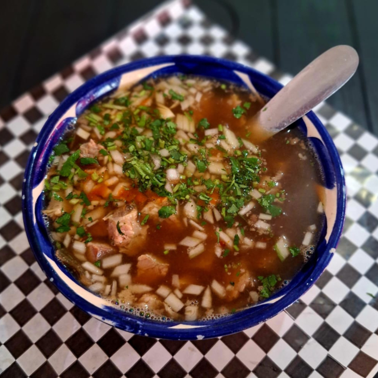 Birria picada SURTIDA (Mix de costilla, chambarete, maciza y gordura) con su respectivo consomé y porción de tortillas; incluye salsa, rajas, chile asado, cebolla, cilantro y limones.