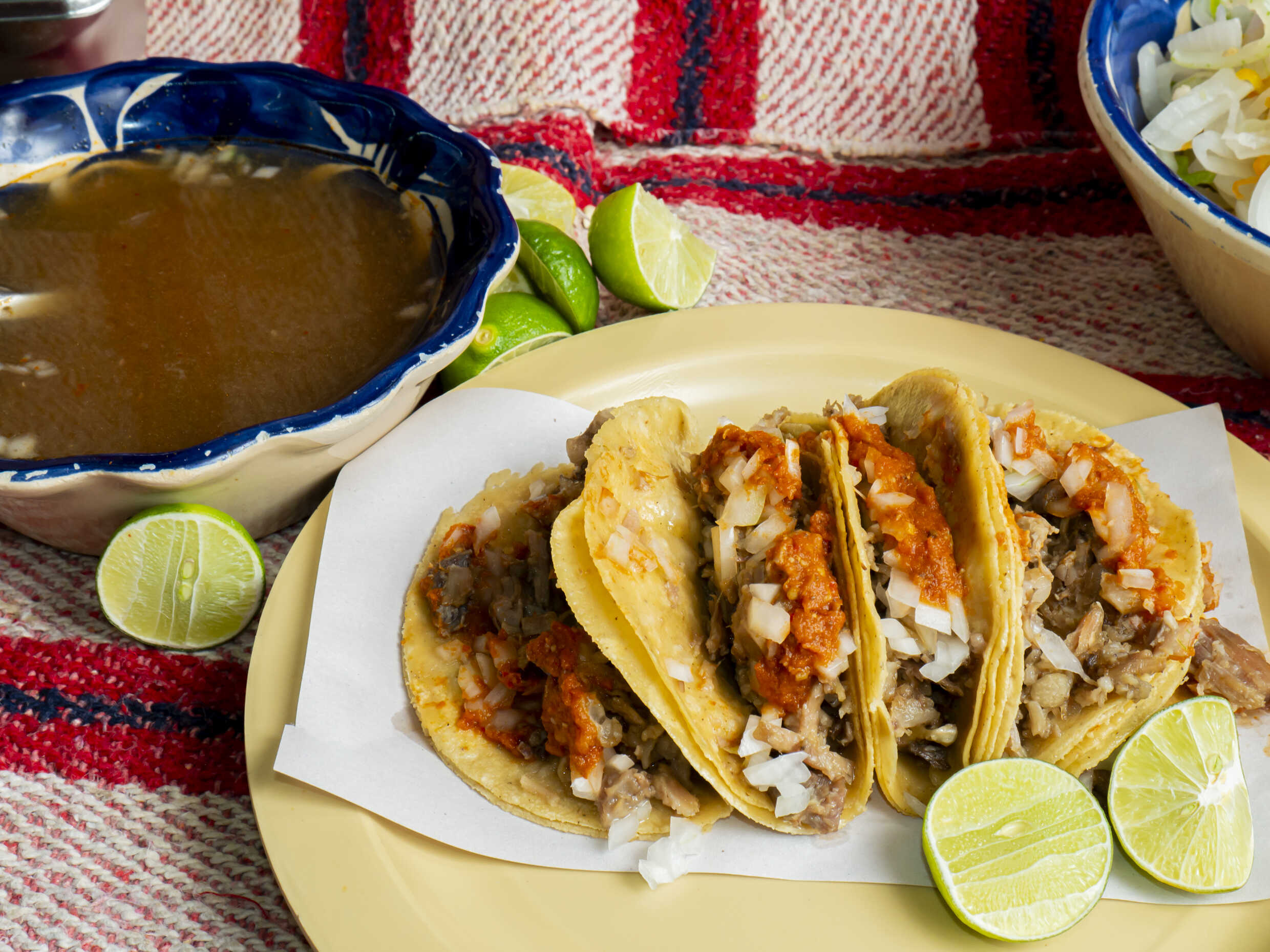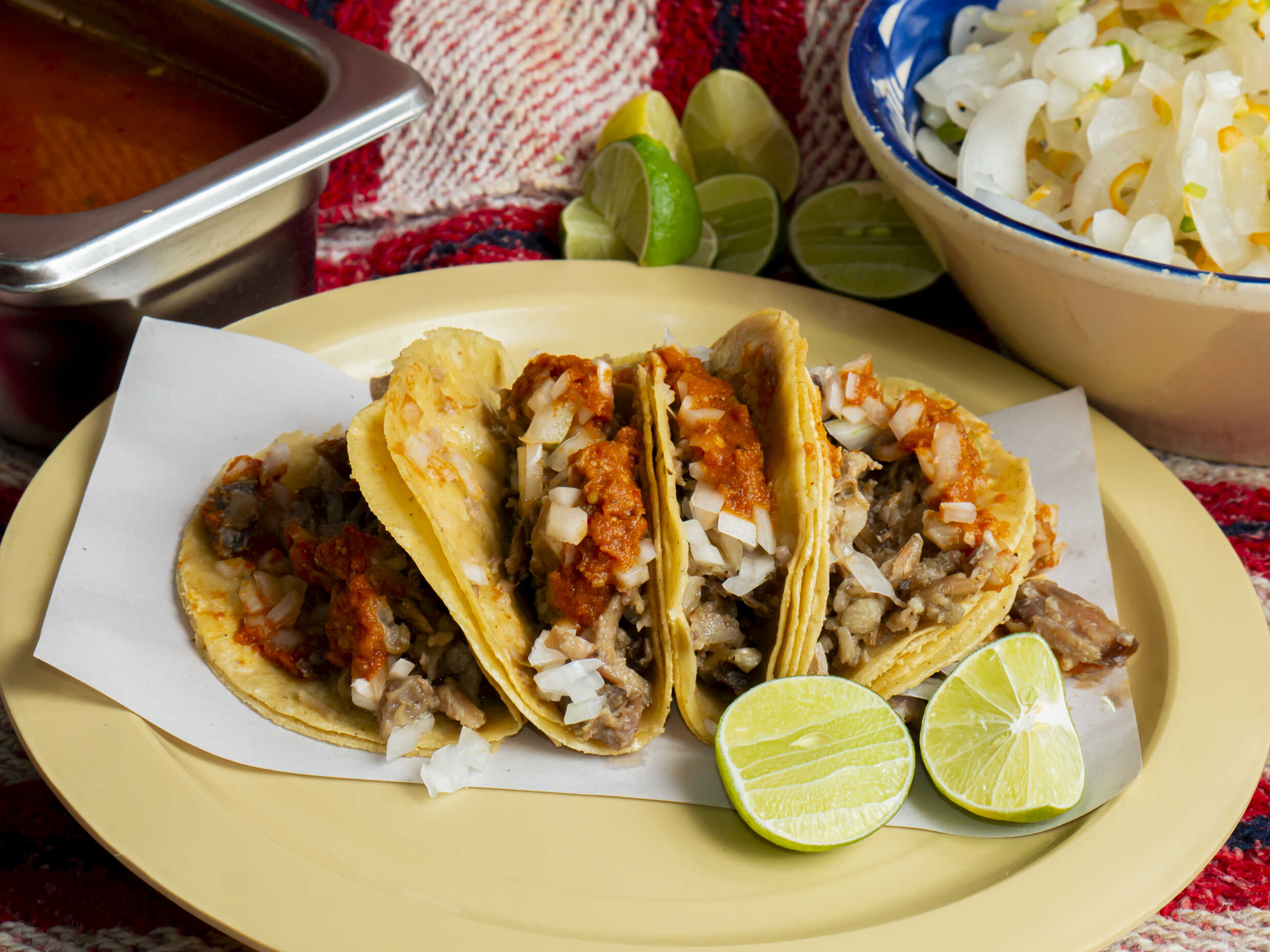 Incluye porción de tortillas, salsa, cebolla, limones, rajas de cebolla con chile de habanero y chile de árbol asado