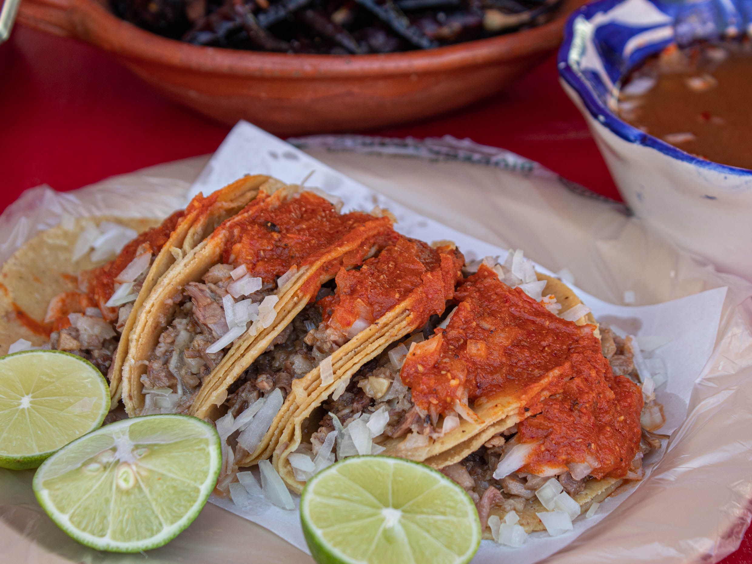 Incluye porción de tortillas, salsa, cebolla,limones,rajas de cebolla con chile de habanero y chile de árbol asado