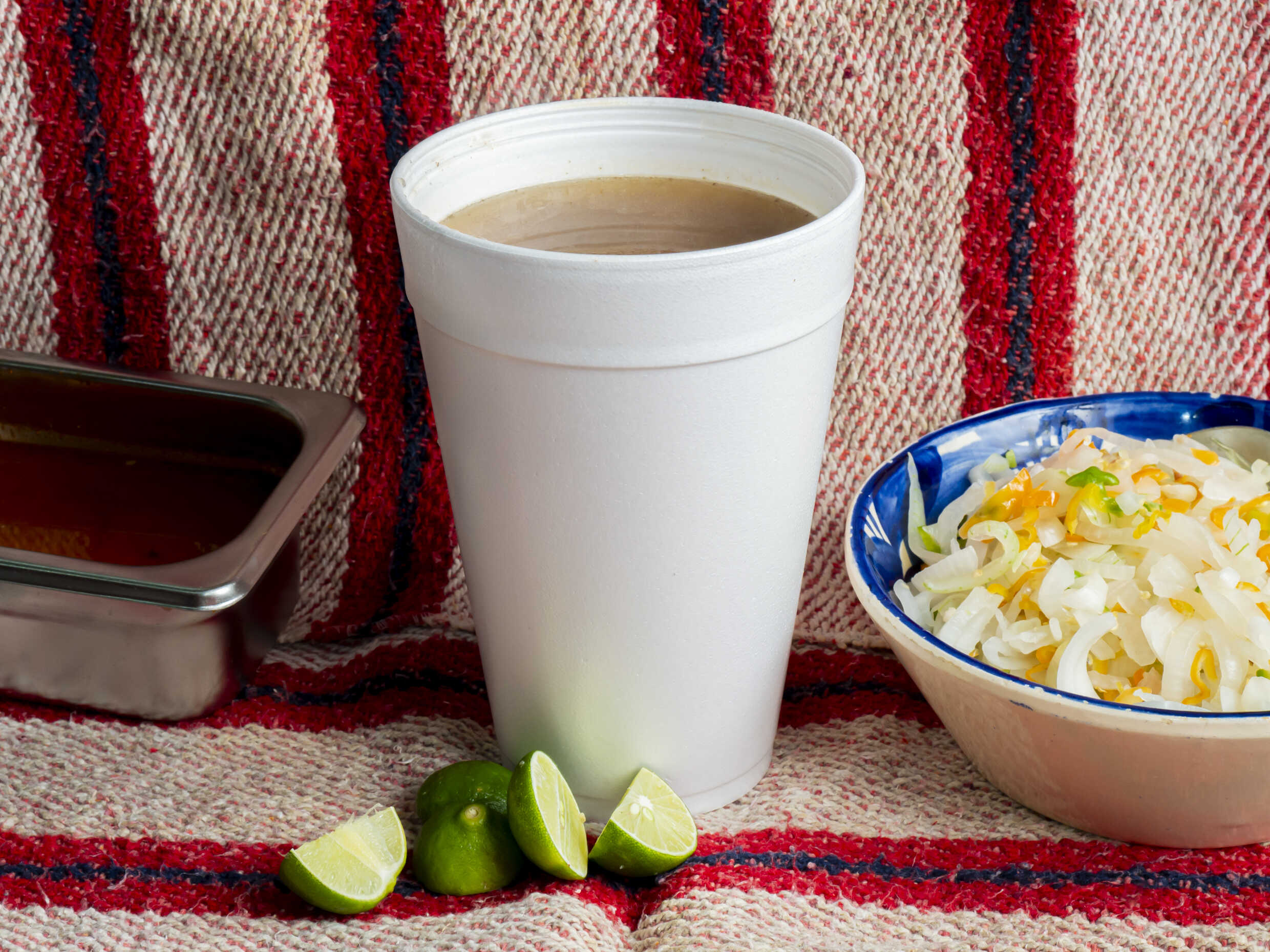 Incluye vaso de consomé, salsa, cebolla, limones y rajas de cebolla con chile de habanero.