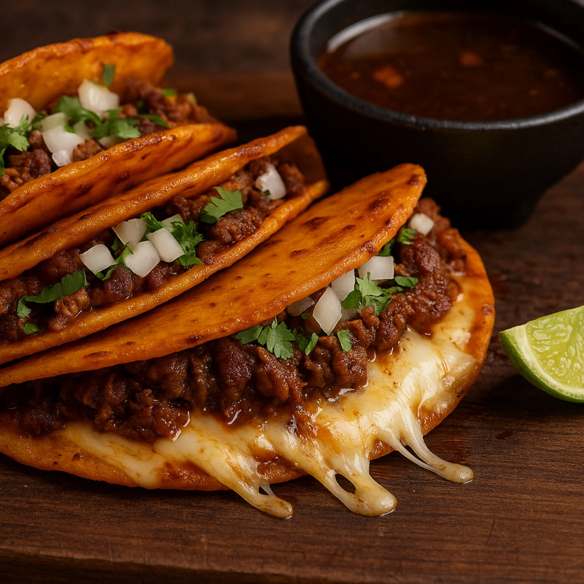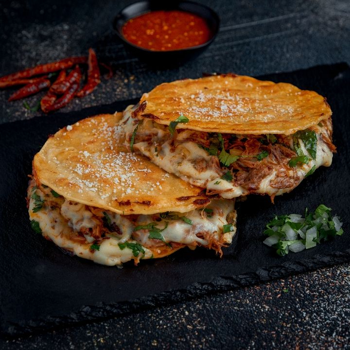 Quesabirria Adobada Tortilla de Harina Incluye : Salsa Roja Morita, Queso Manchego , Cebolla Picada, Cilantro , Limones, Birria De Res Estilo Guadalajara....Buen Provecho