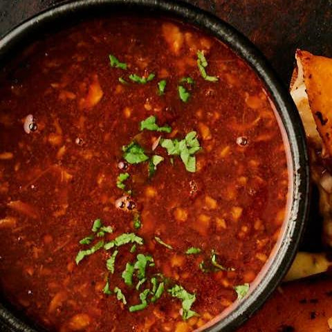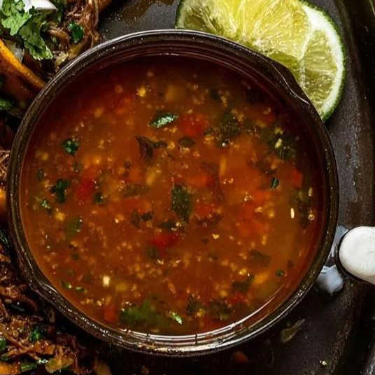 Plato de consomé de 1 litro con birria estilo jalisco bej, tortillas y complementos.