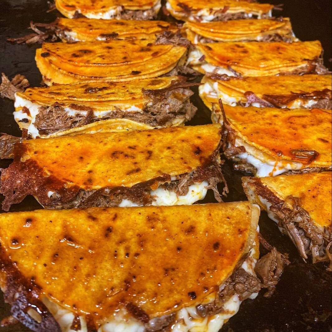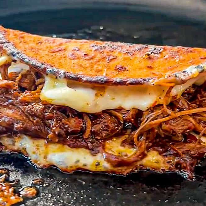 1 Tortilla de maíz bañada en adobo especial, rellena de queso mozzarella y nuestra tradicional birria estilo jalisco.