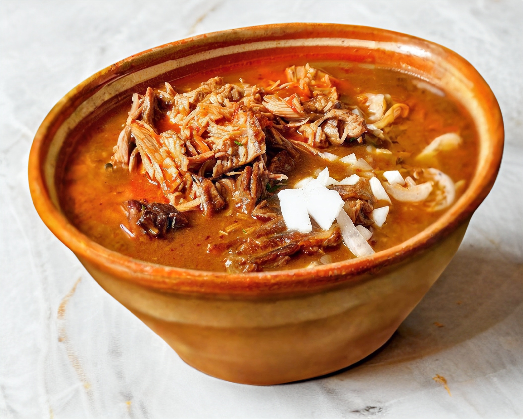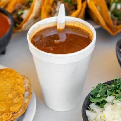 Litro de consomé de birria, acompañado de cebolla, cilantro y salsa.