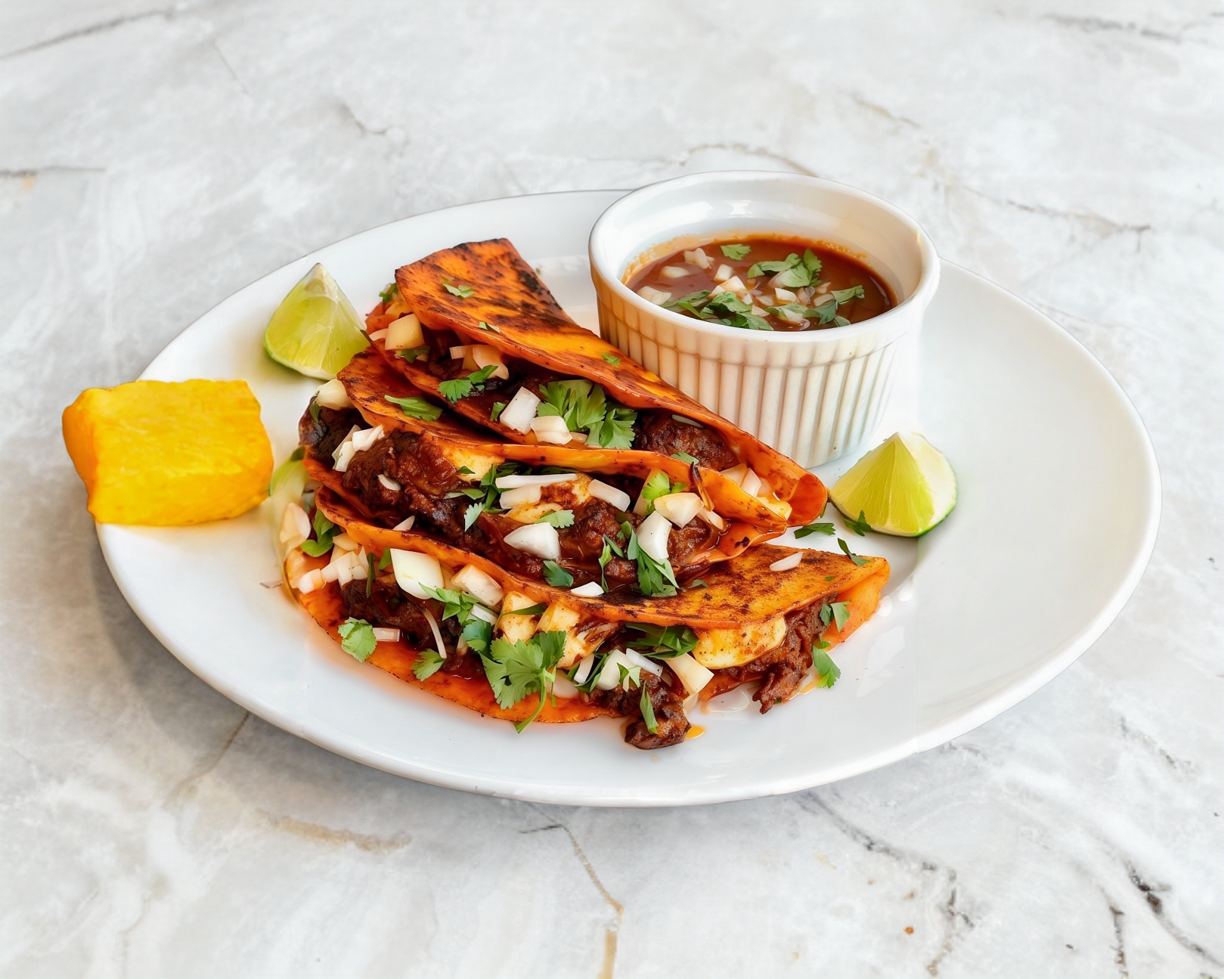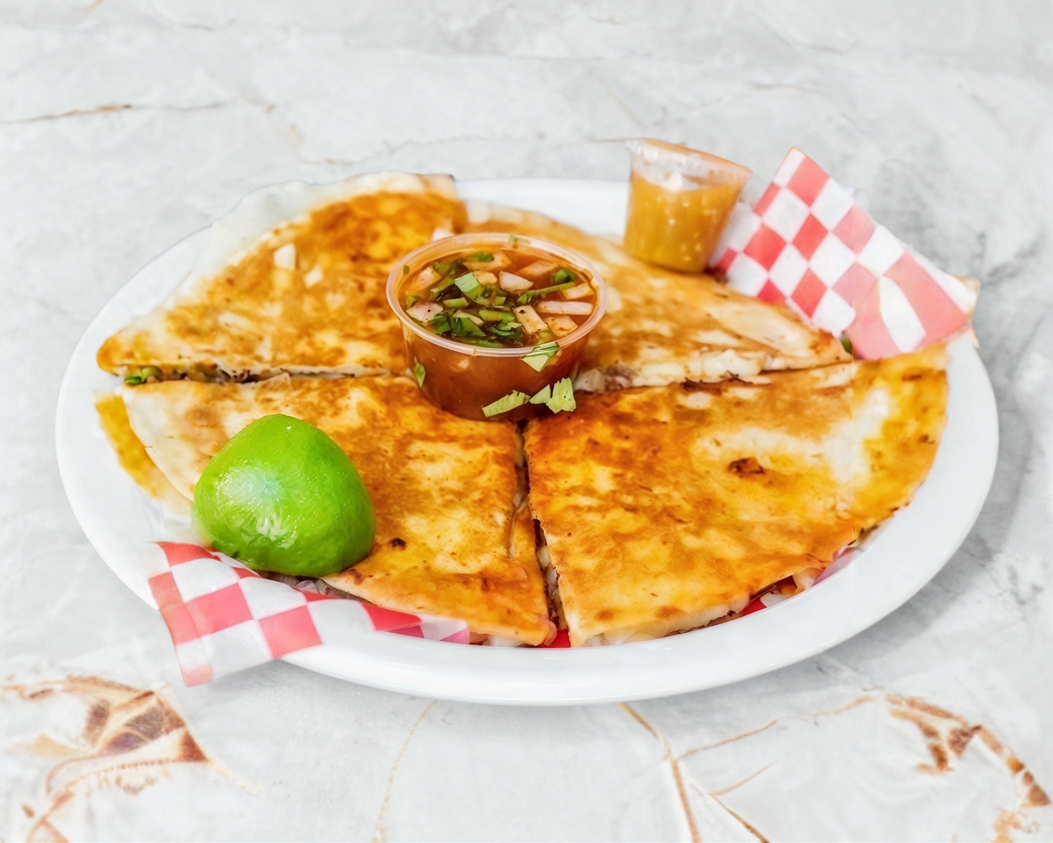 Deliciosa quesabirria con carne de res y queso fundido en dos tortillas de maíz, acompañada de cebolla, salsa y limón.