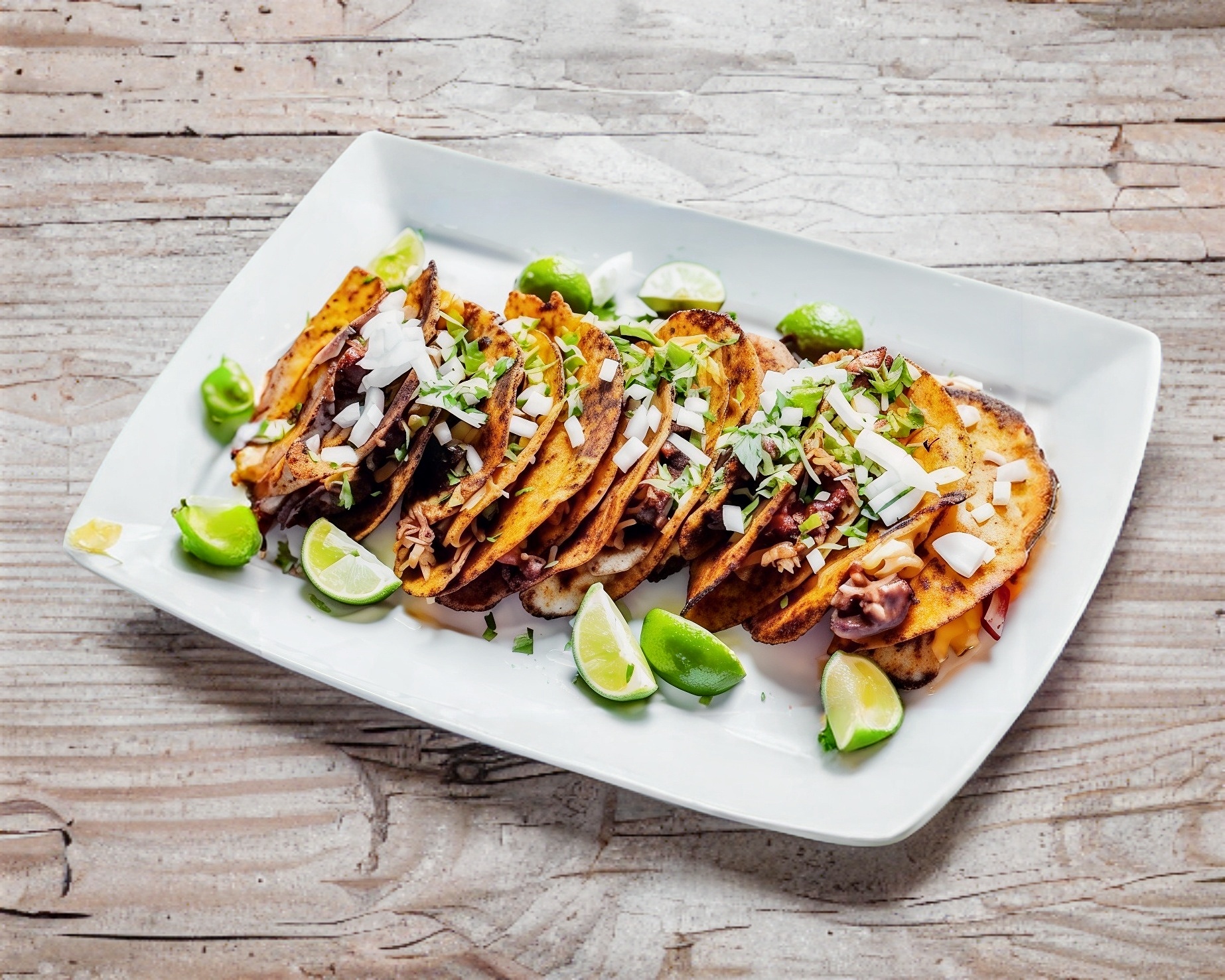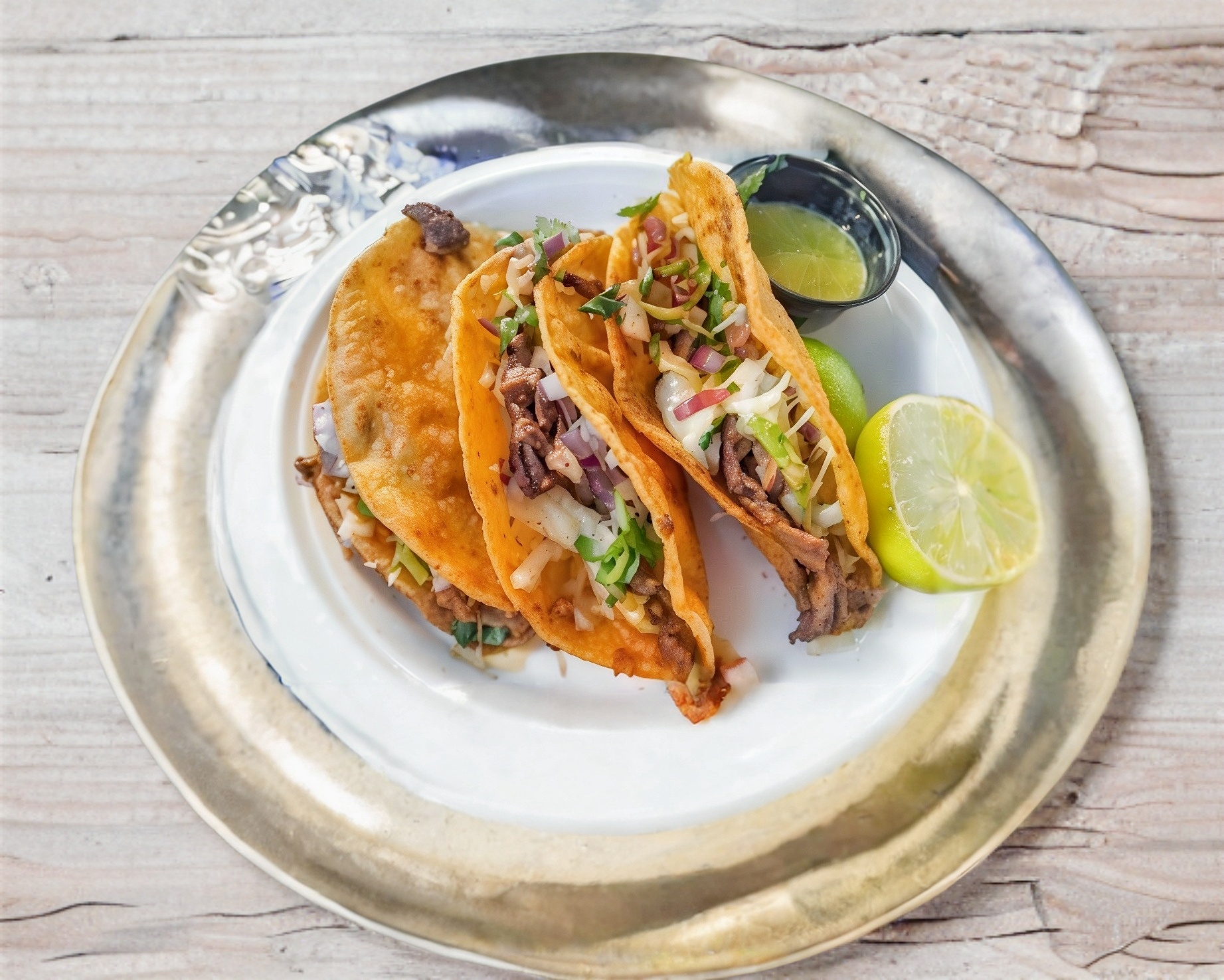 Tacos en tortilla de maíz con cebolla, cilantro y salsa verde o roja a elegir.