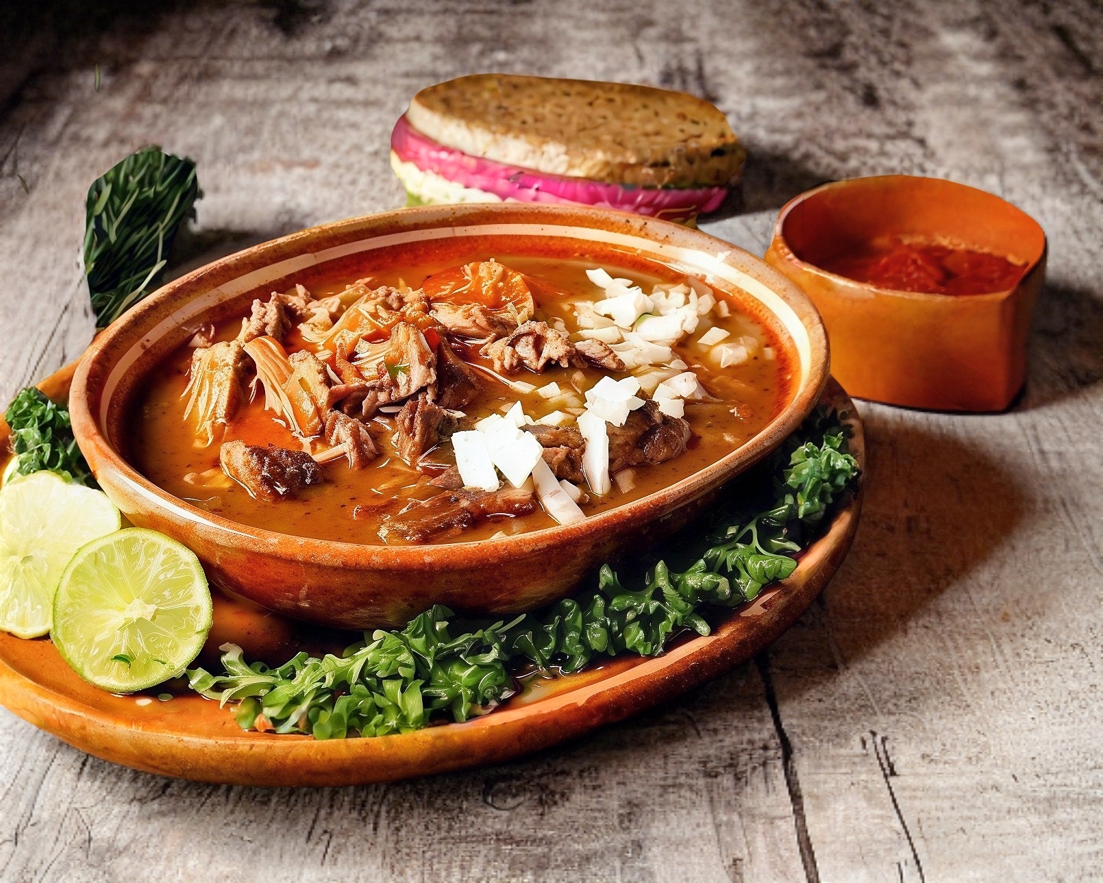 Platillo personal: Consomé con cebolla, cilantro y carne de birria.