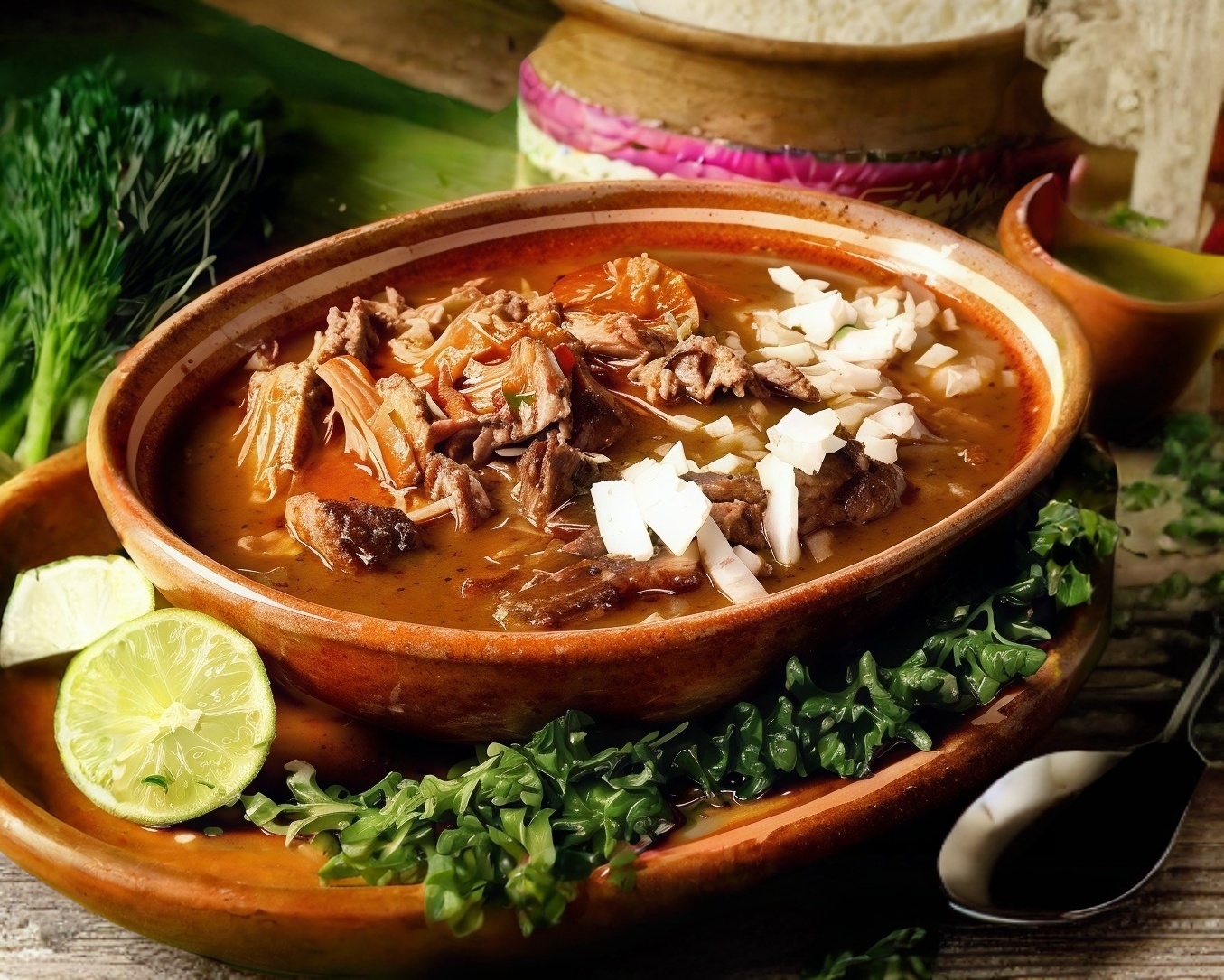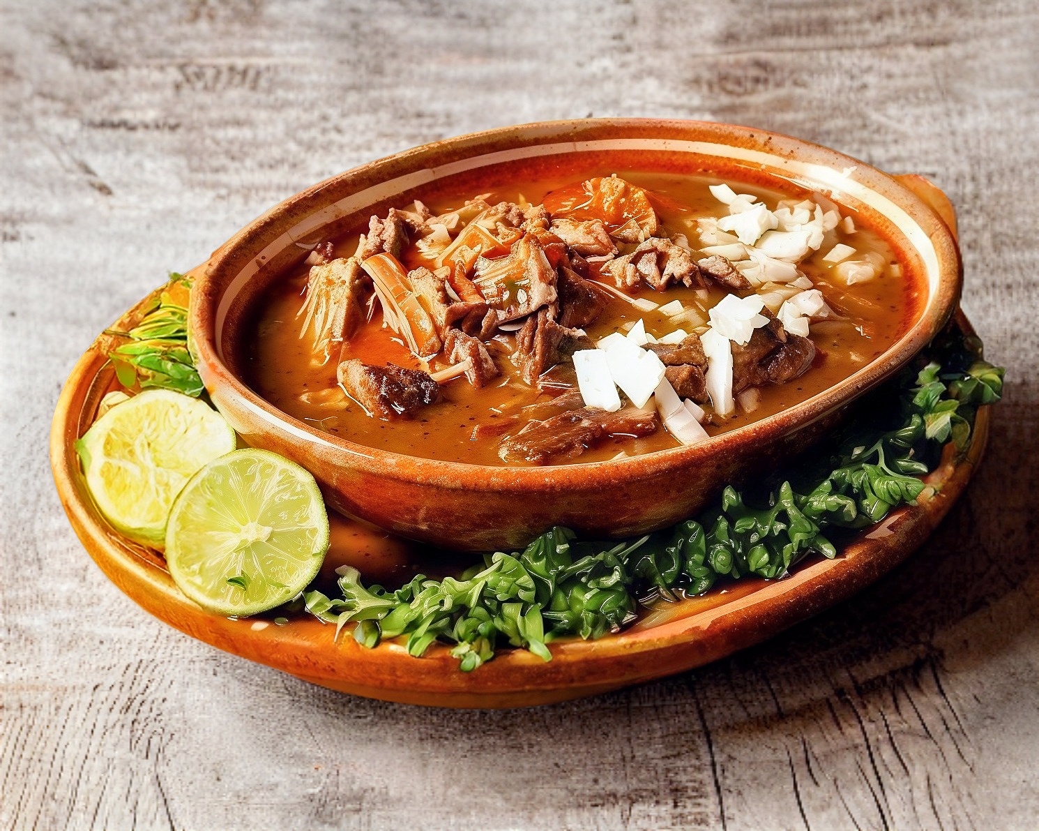 Consomé con cebolla, cilantro y carne de birria.
