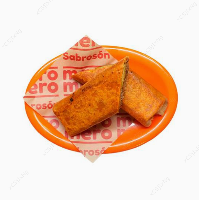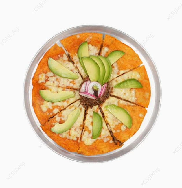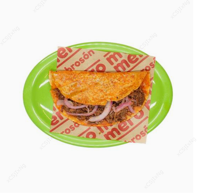 Doble tortilla de harina de 30 cm birria de res queso cheddar y queso Oaxaca en el centro queso mozzarela birria de res y aguacate arriba incluye un consomé de 300 ml.