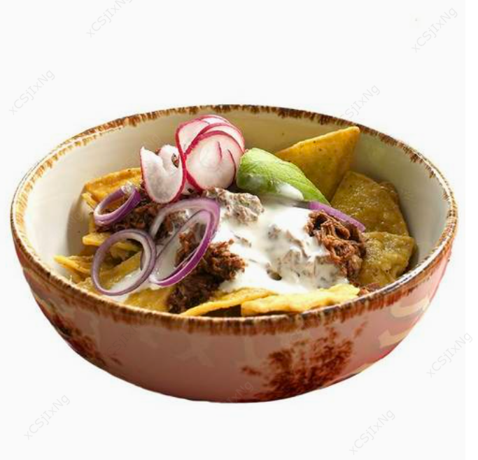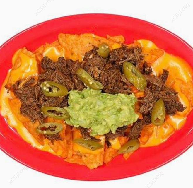 Totopos nachos, birria, guacamole, queso nachos y chiles jalapeños.