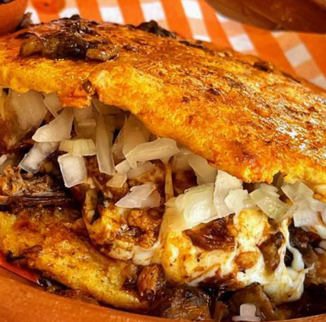 Gordita de chicharrón queso Oaxaca, birria de res y cebolla blanca.