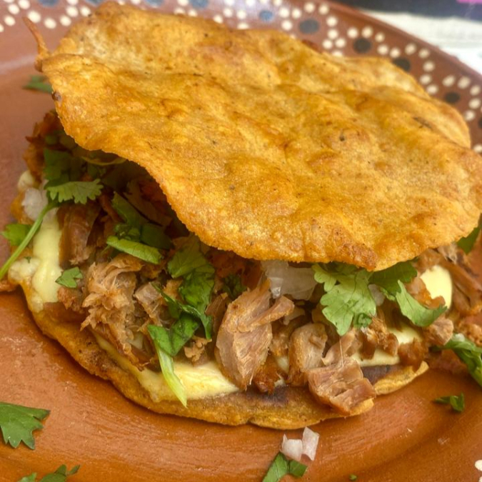Tortilla de maíz dorada con queso, birria de res, cebolla, cilantro y salsa roja o verde.