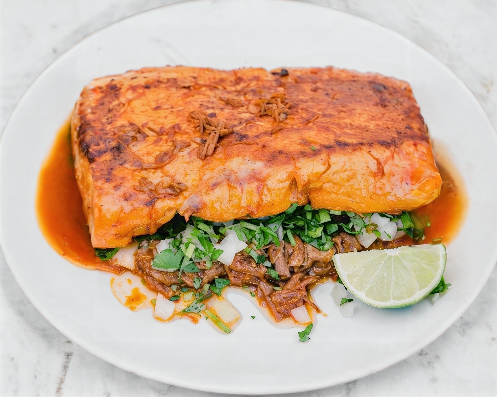 Nuestra birriacha con queso gratinado sobre una tortilla dorada.