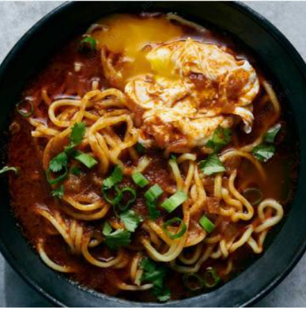 Delicioso ramen de pollo acompañado de consomé de birria, alga (nori), huevo cocido, cebolla, cilantro. (Porción de 500 ml)