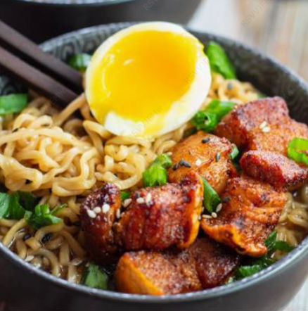 Delicioso ramen acompañado de consomé de birria, alga (nori), huevo cocido y pork belly. (Porción de 500 ml)