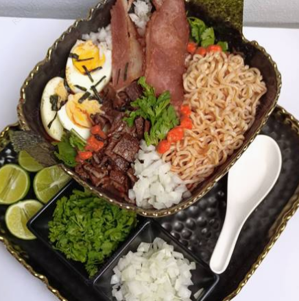 Delicioso ramen de birria de borrego, pollo y pork belly acompañado de consomé de birria, alga (nori), huevo cocido, cebolla, cilantro. (Porción de 1 L)