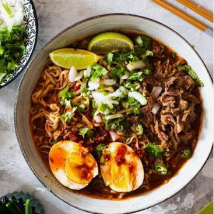 Delicioso ramen de birria de borrego acompañado de consomé de birria, alga (nori), huevo cocido, cebolla, cilantro. (Porción de 500 ml)