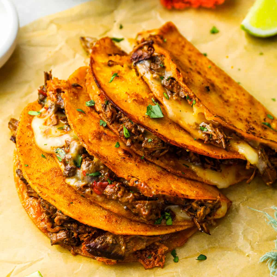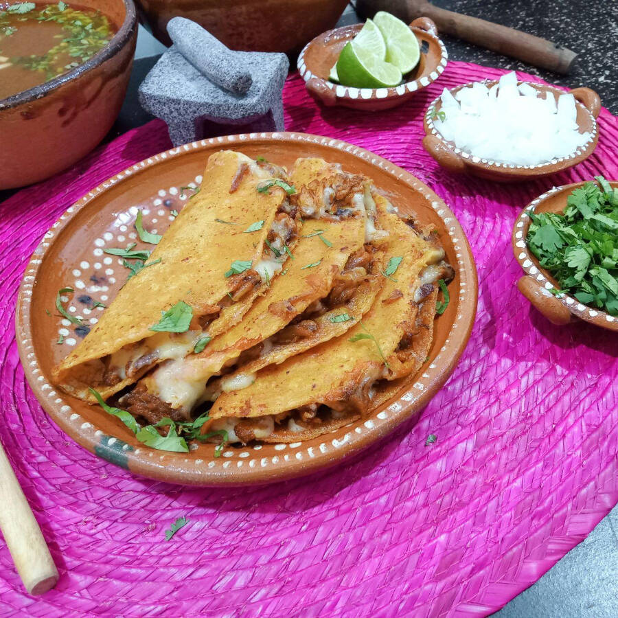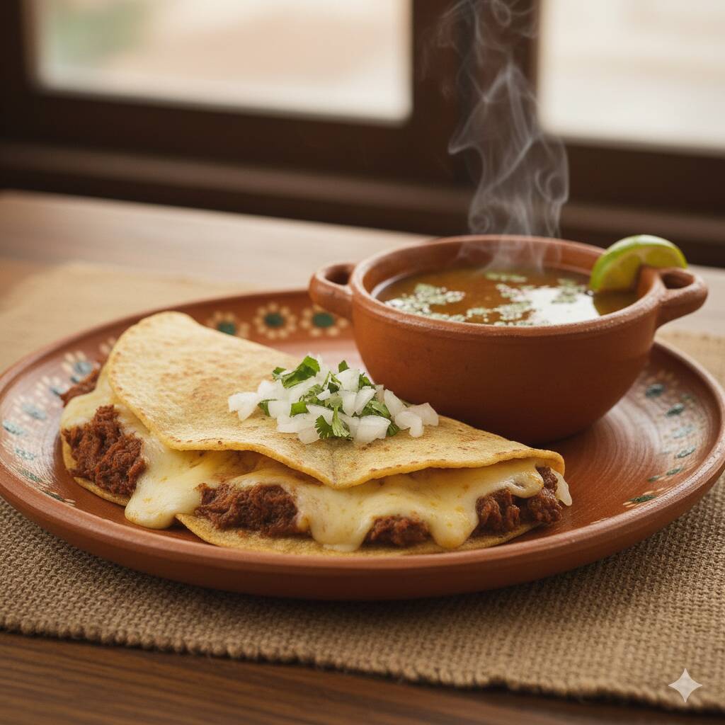 Tortilla de maíz con queso, rellena de nuestra birria casera.