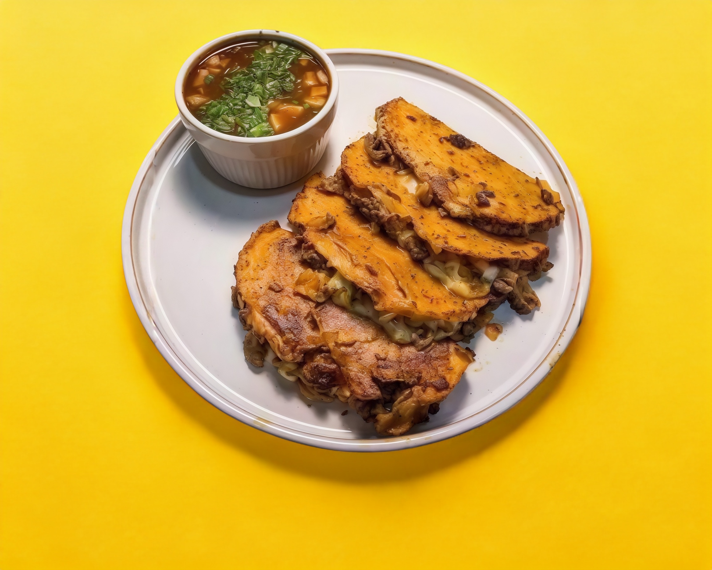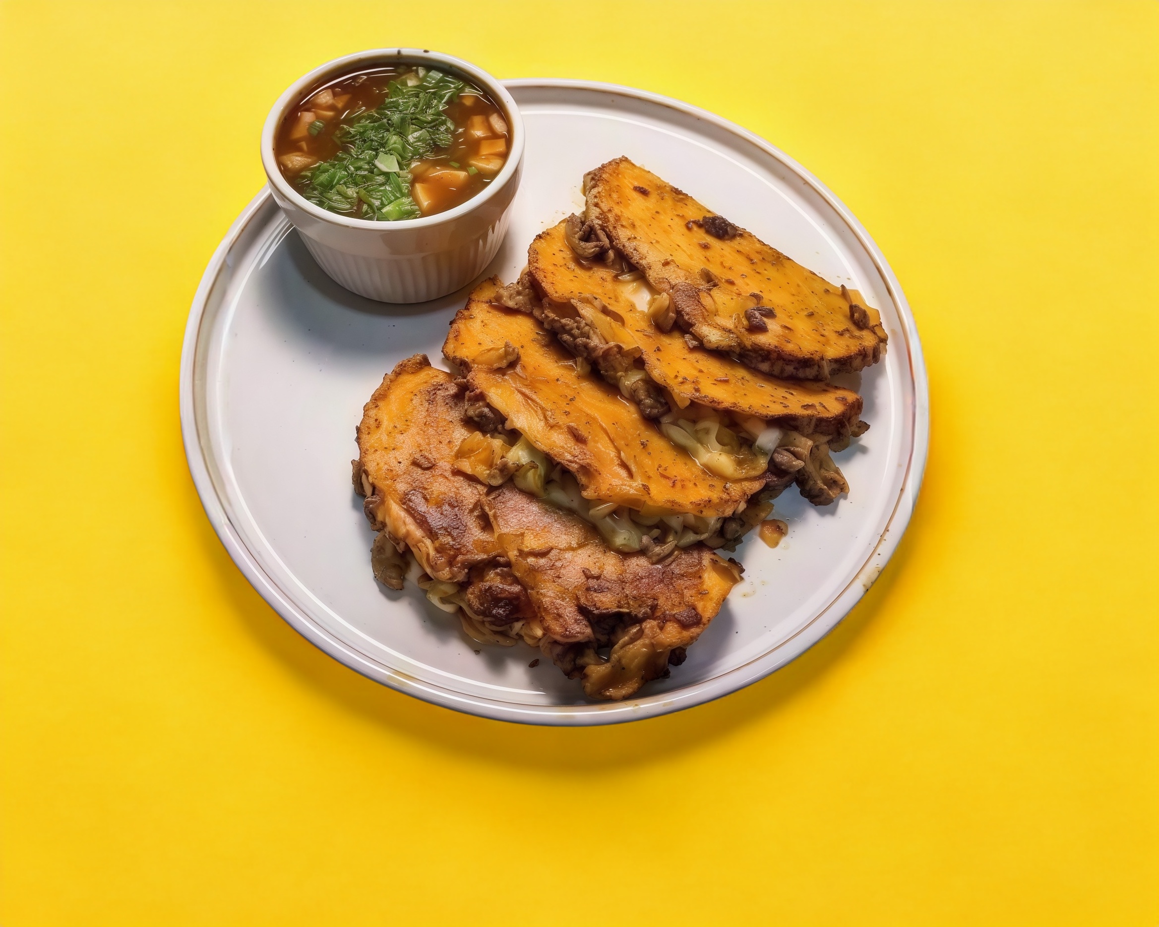 Tres piezas con consomé pequeño (230ml), tortilla de maíz doradas, con queso y carne de res