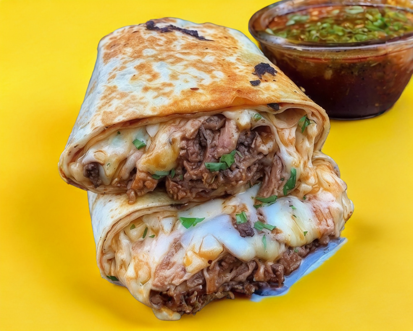 gringa de birria individual de tortilla de harina (15 cm apróx. Dividida en 4 pz) con queso y carne, incluye consomé (230 ml), salsa roja, limon y cilantro y cebolla. mente)) con queso y carne de res
