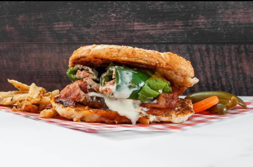 Deliciosa carne de hamburguesa, tocino, queso amarillo, boneless bañados en nuestra salsa búfalo, jitomate, lechuga, cebolla, pepinillos