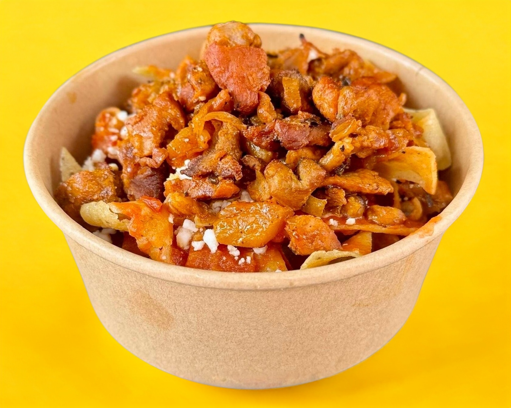 Crujientes totopos en tiras bañados en salsa Roja o Verde servidos con 90grm. de adobo de puerco y cebolla, acompañado de los toppings.