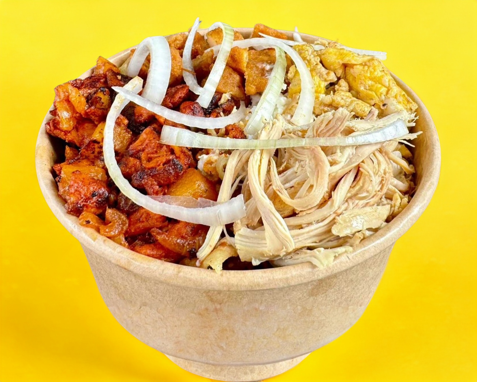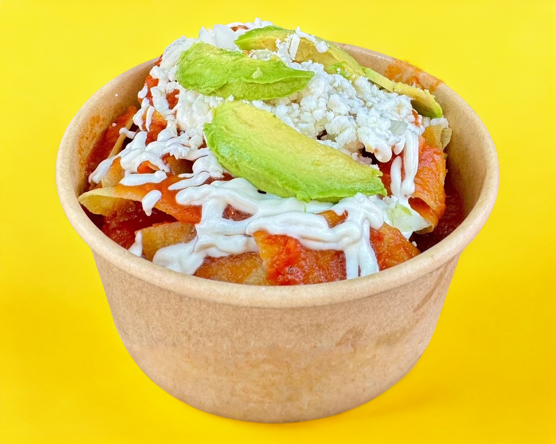 Crujientes totopos en tiras bañados en salsa Roja o Verde servidos con 60grm. de pollo deshebrado y los toppings.