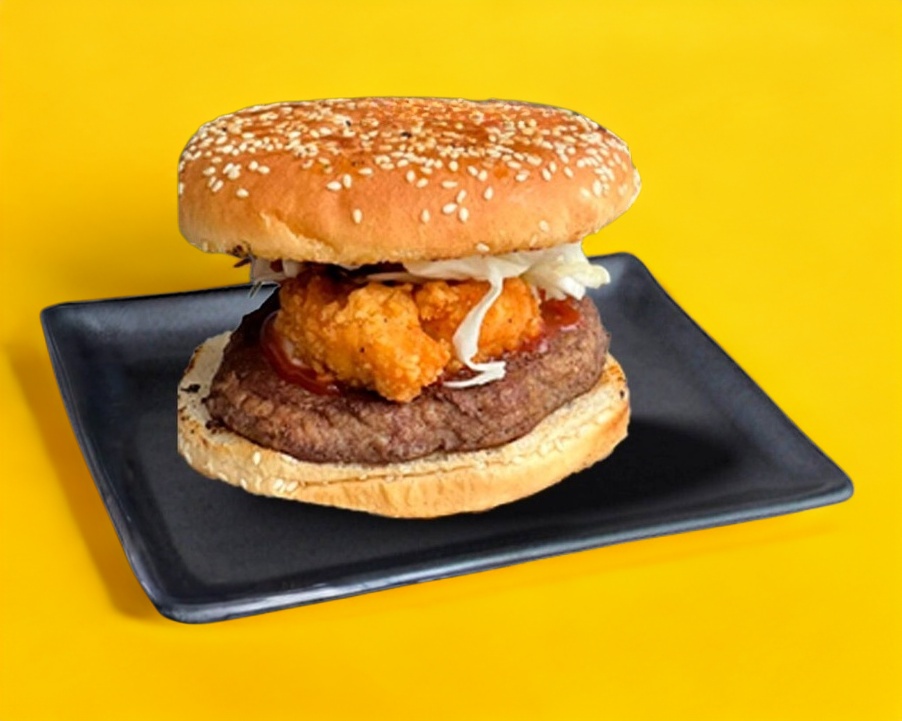 Rica hamburguesa especial Black con 1/4 de libra de 100% res con crujientes tiras de pechuga de pollo empanizadas y fritas servida con toppings.