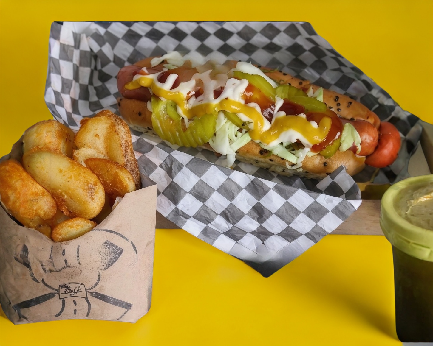 Hot dog de salchicha de pavo jumbo de 100 grs. con aderezos (mayonesa, mostaza y catsup), cebolla caramelizada y 5 toppings (repollo, pepinillos, chimichurri, salsa macha y rajas).