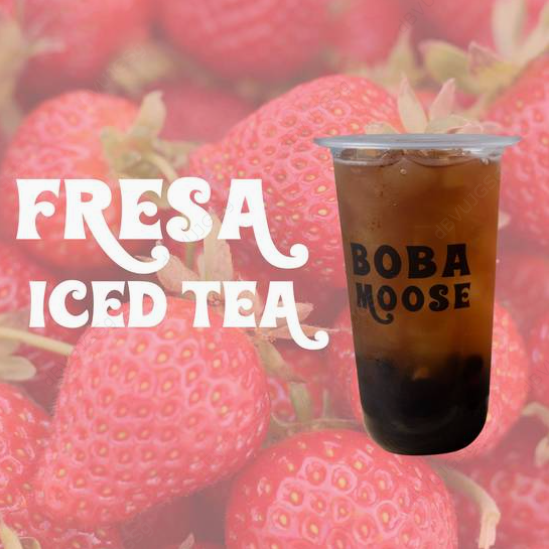Bebida con jarabe de fresa, té a elegir entre oolong, verde o negro, perlas de tapioca y hielos.