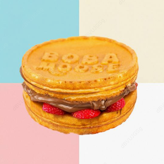 Dos waffles doraditos rellenos de Nutella y fresas. Crujiente, cremoso y perfectamente dulce.