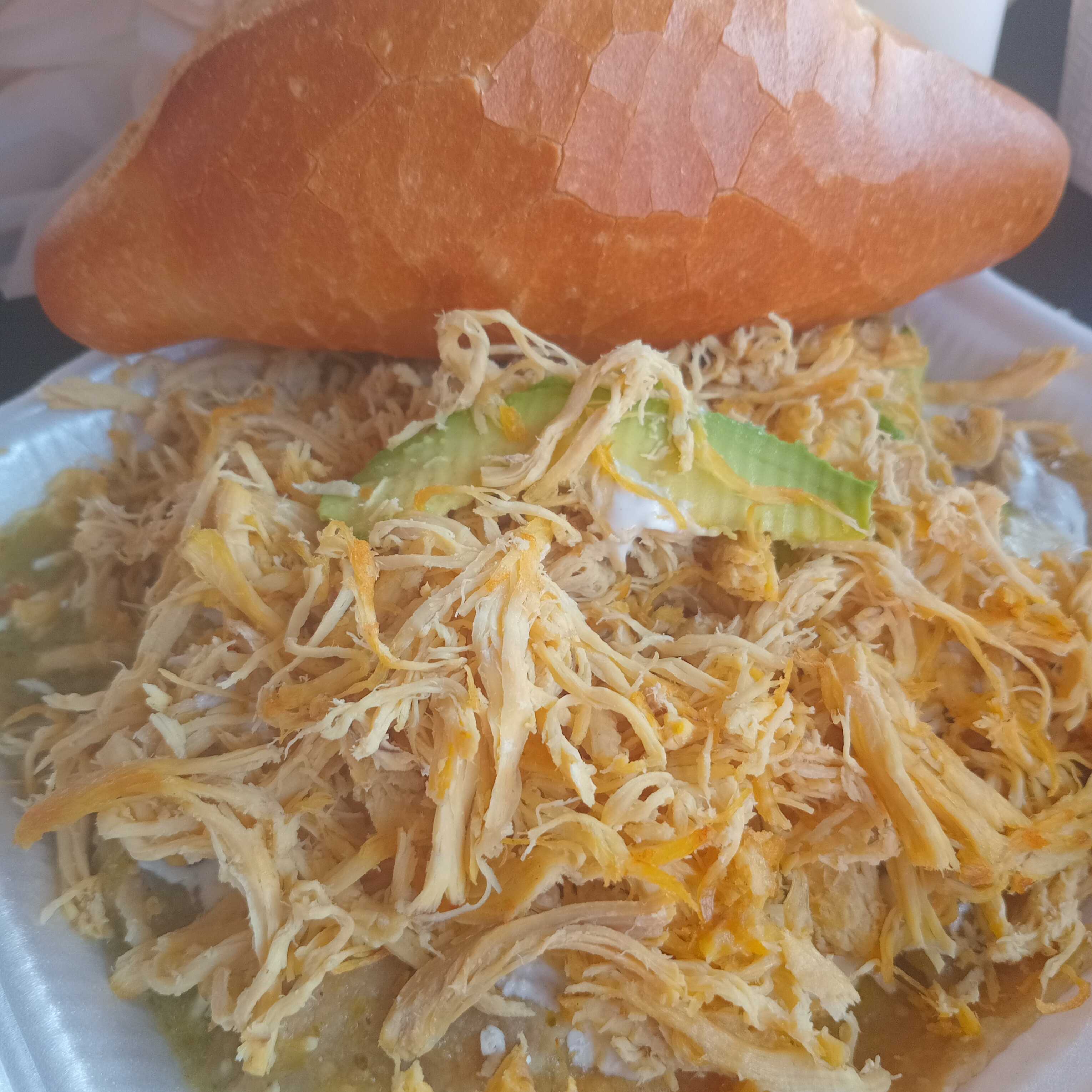 Crujiente totopos bañados en deliciosa salsa verde con trozos de carne sazonada, acompañados de crema y queso