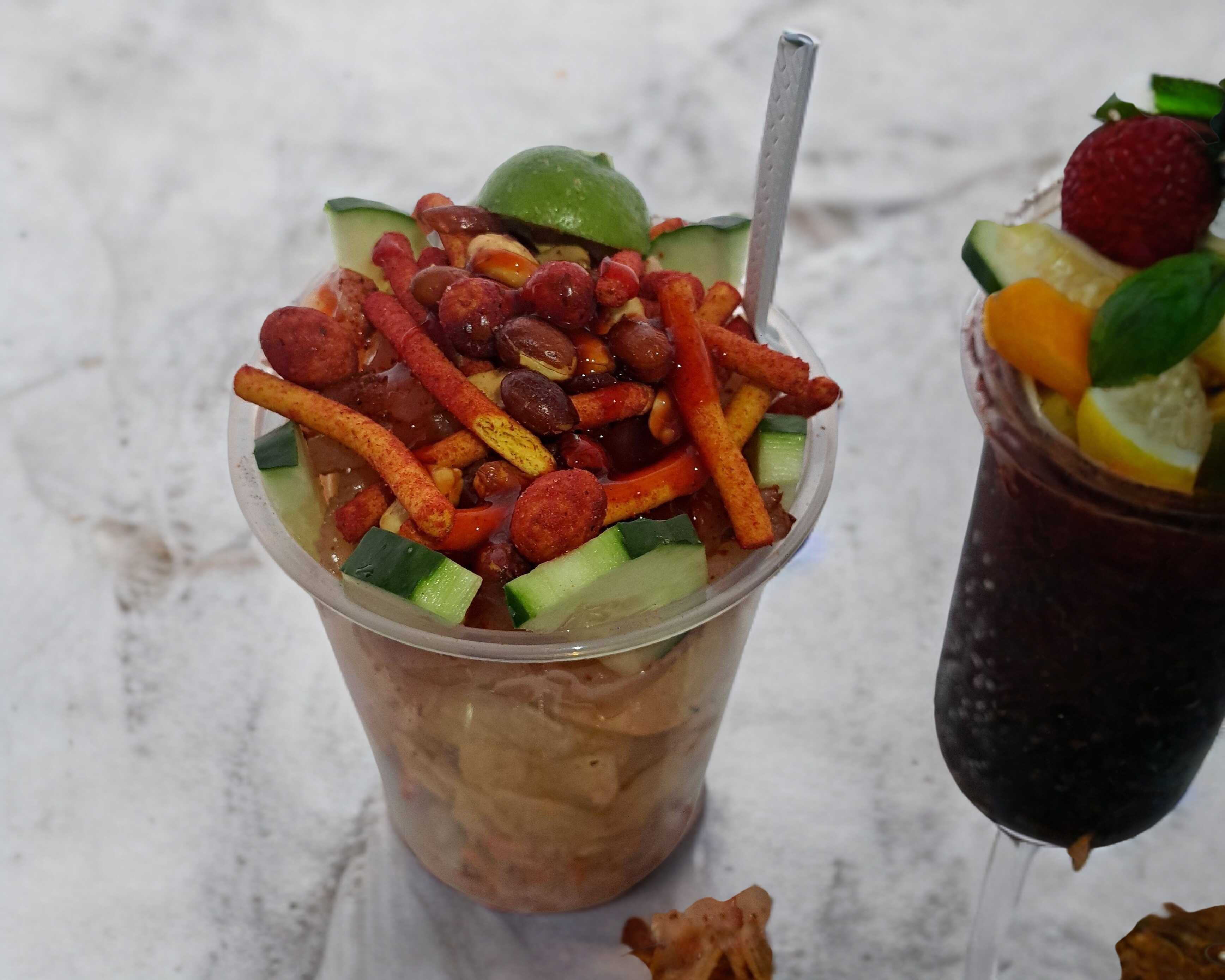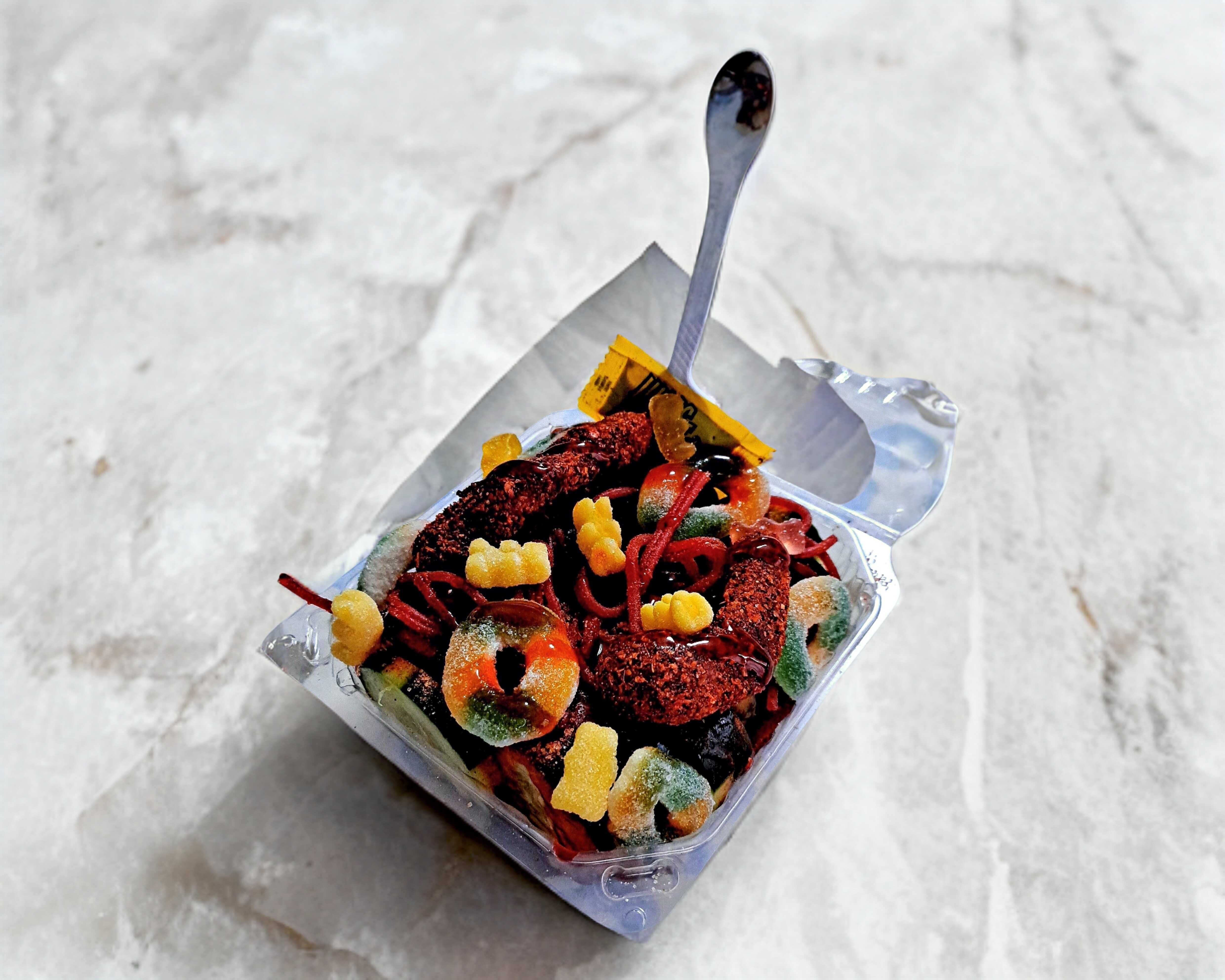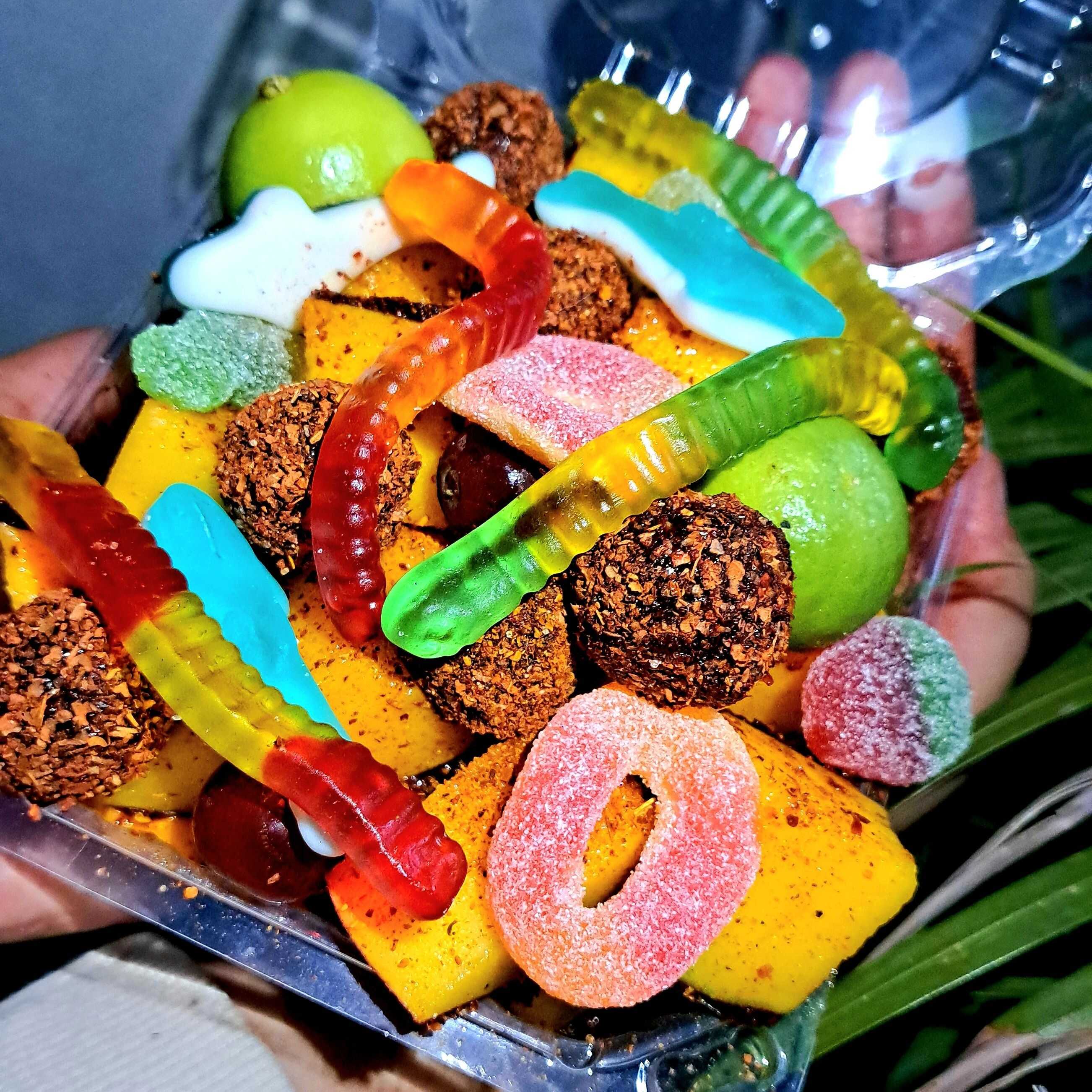 Uvitas y rodajas de pepino envueltos en pulpa de tamarindo, empanizados con tajin y gomitas dulces