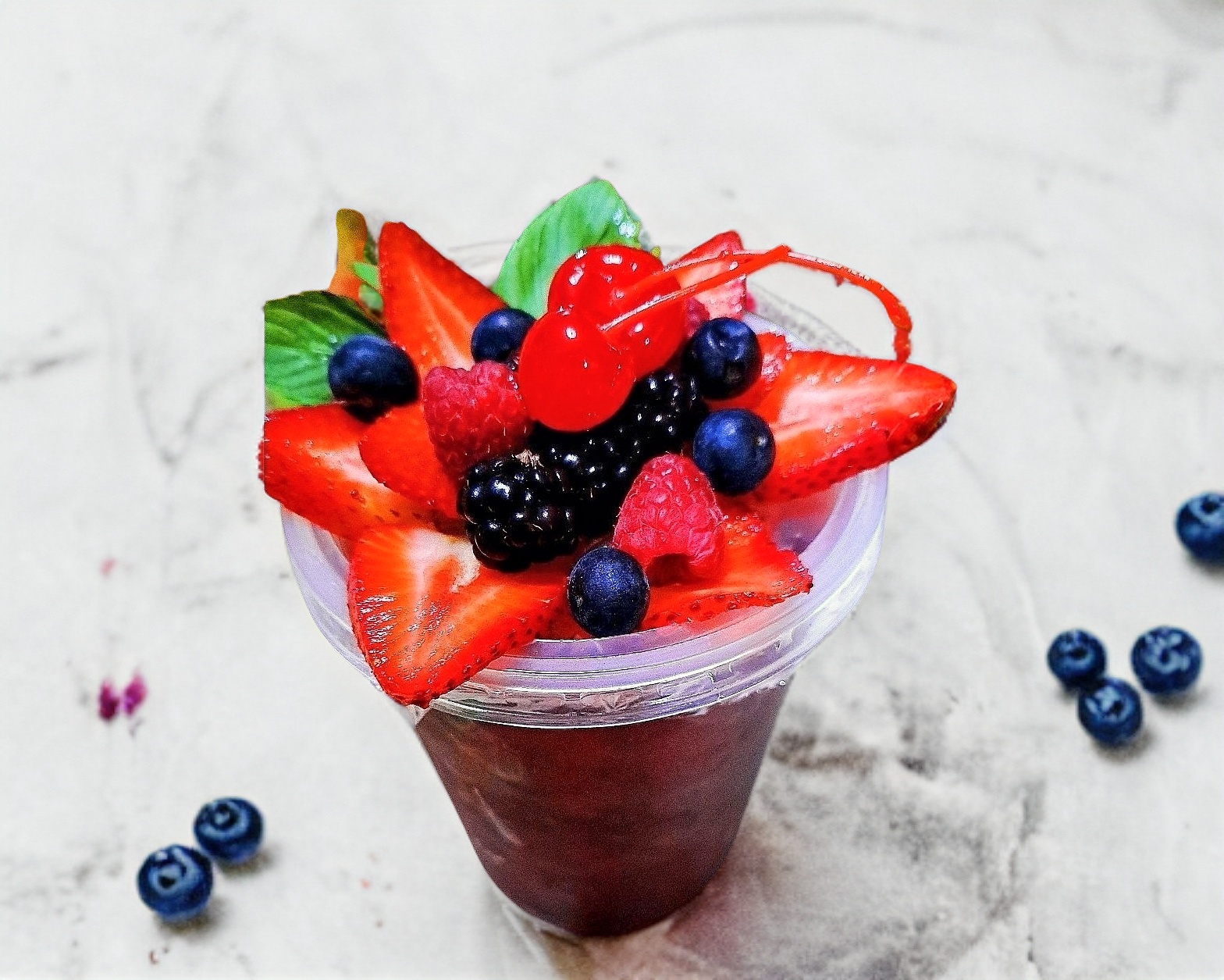 Vaso de 1 lt, Frutos rojos, hierba buena , endulzante, 4oz de Ron jugo, y refresco